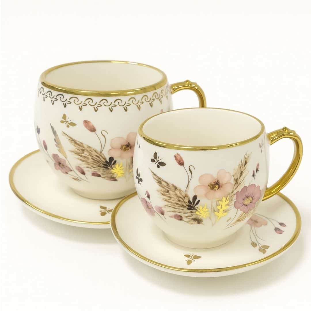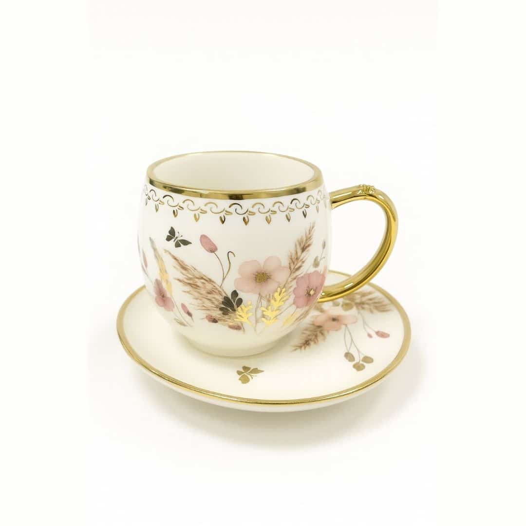 Unesite eleganciju na svoj sto uz ovaj raskošni set od 6 porculanskih šolja sa tacnama, ukrašenih nježnim cvjetnim motivima i luksuznim zlatnim detaljima. Svaka šolja je posebno dizajnirana kako bi spojila modernu estetiku i klasičnu ljepotu — idealno za kahvu, čaj ili posebne trenutke sa dragim osobama.