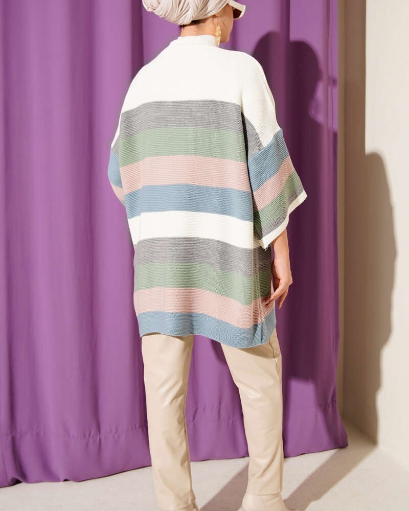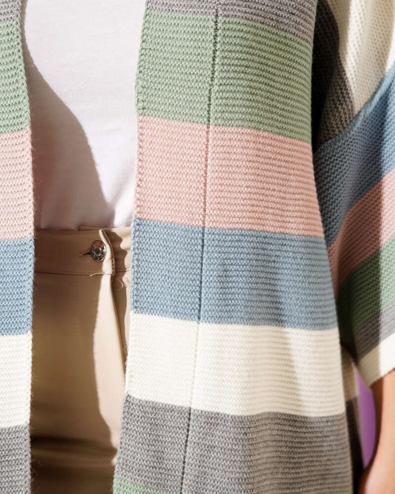 Široke, vodoravne pruge u više boja daju kardiganu upečatljiv izgled i omogućavaju lako kombinovanje s jednostavnim, jednobojnim majicama, tunikama, košuljama ili farmericama. Bilo da ga nosite za posao, odlazak na kafu ili svakodnevne obaveze — ovaj kardigan će podići svaku kombinaciju.